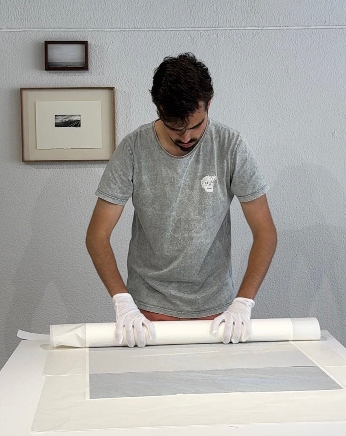 - Lay the artwork on a clean, flat surface. If you’ve got gloves, now is the time to use them. Carefully peel away the protective paper.